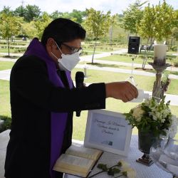 En esta actividad se colocaron hermosas rosas blancas sobre el altar donde se exhibía una preciosa urna de cristal de roca que contenía los nombres de los fallecidos en Puerta del Cielo del Covid-19 y de las personas que fallecieron en esta época de Pandemia. El Padre Roberto Solano, párroco de Puerta del Cielo, invocó al Todopoderoso por el descanso eterno de los fallecidos, pidió al Señor por el consuelo y esperanza de los familiares y extendió una bendición a los que descansa en el Camposanto.